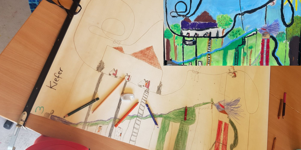 2. Tag: 2 Std. 1. Stunde: Die Kinder haben ihre Ideen vorgetragen, Beobachtungen geteilt. Umweltgedanken – mehr Solaranlagen/ günstiger, mehr Pflanzen und Naturschutz, Sicherheit im Straßenverkehr – neue Transportmöglichkeiten, Rad und Gehwege getrennt, neue Straßen, die leuchten, Sauberkeit – Müllentsorgung, Freizeitangebote – Groten Dike mit Strand, Badestelle, Seilbahn übers Wasser, Spielplätze für alle Altersklassen. Traumreise in einer Zeitmaschine ins Jahr 2075 in Großhansdorf. 2. Stunde: Jedes Kind malt ein Bild mit seinen Wünschen/ Bildern aus der Traumreise oder seiner Vorstellung der Welt von morgen.