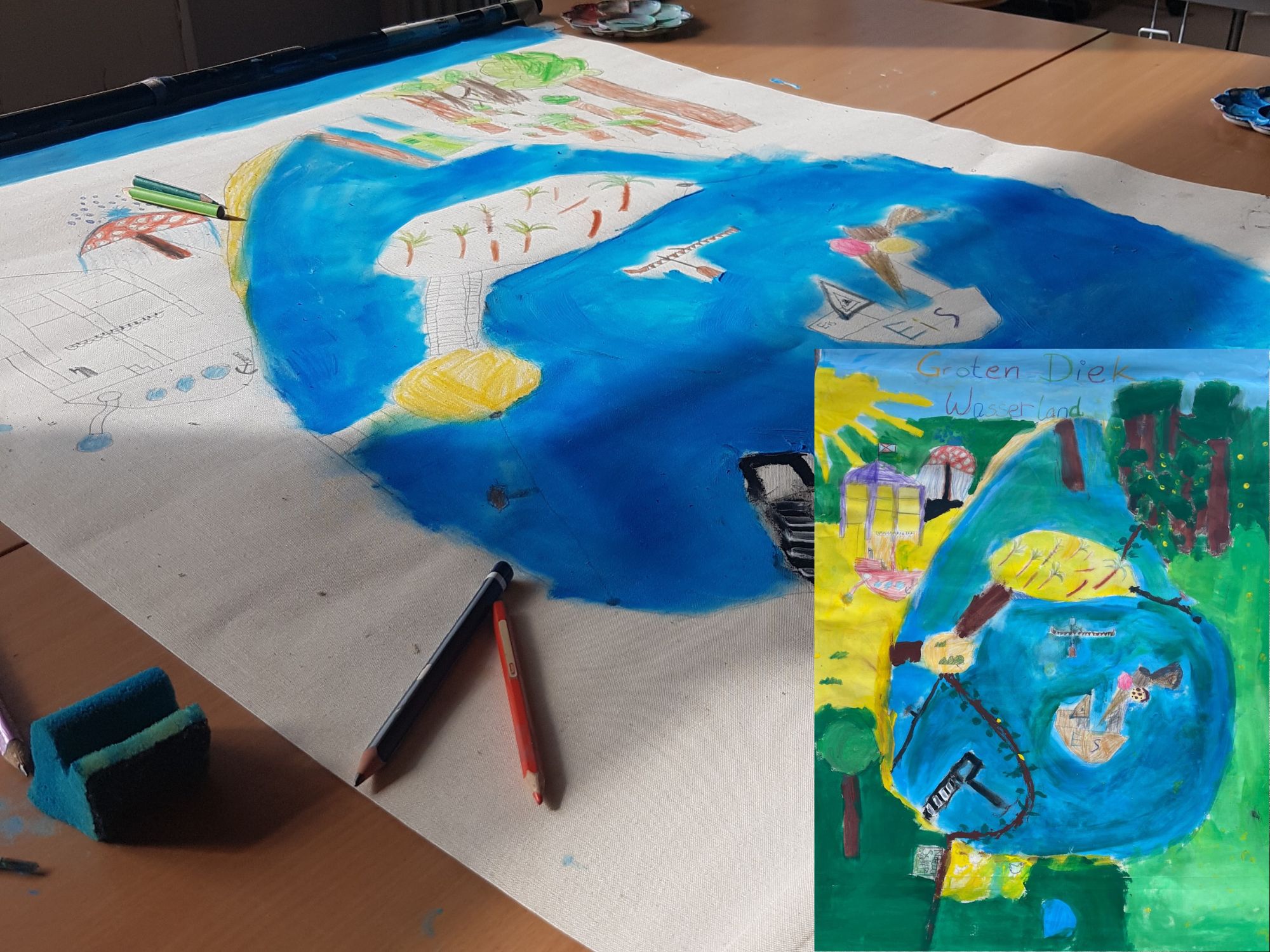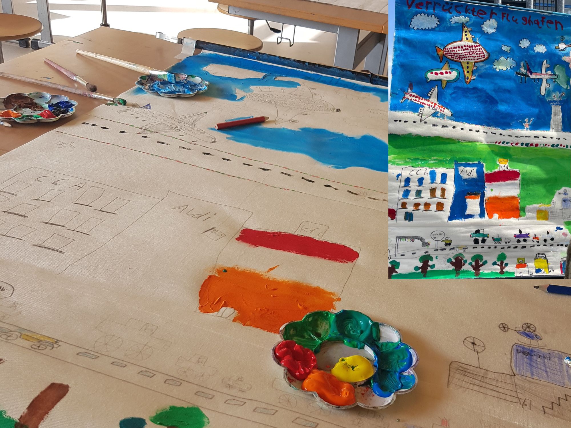 4. Tag: 4 Std. 1-4. Stunde: Einzelleinwände verfeinert und fertig gestellt. Große Landkarte in unterschiedlichen Gruppen, je nachdem wer gerade Zeit und Lust hatte, gestaltet und fertig gestellt. Fotokollage der Orte, die die Kinder an Tag 1 gemacht haben.