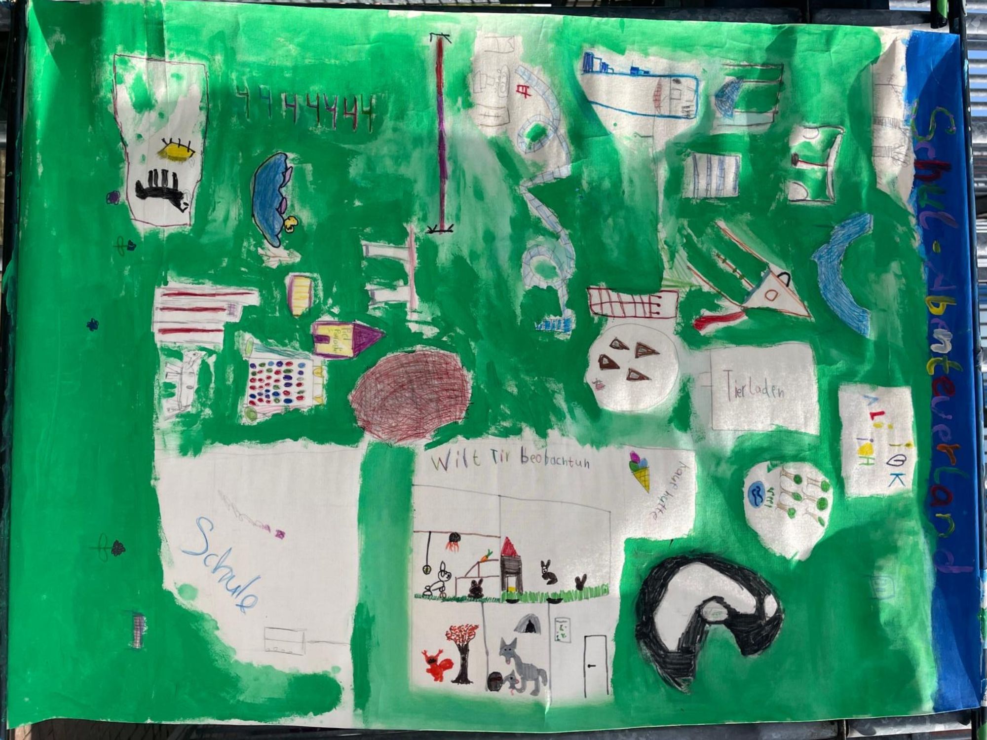 4. Tag: 4 Std. 1-4. Stunde: Einzelleinwände verfeinert und fertig gestellt. Große Landkarte in unterschiedlichen Gruppen, je nachdem wer gerade Zeit und Lust hatte, gestaltet und fertig gestellt. Fotokollage der Orte, die die Kinder an Tag 1 gemacht haben.