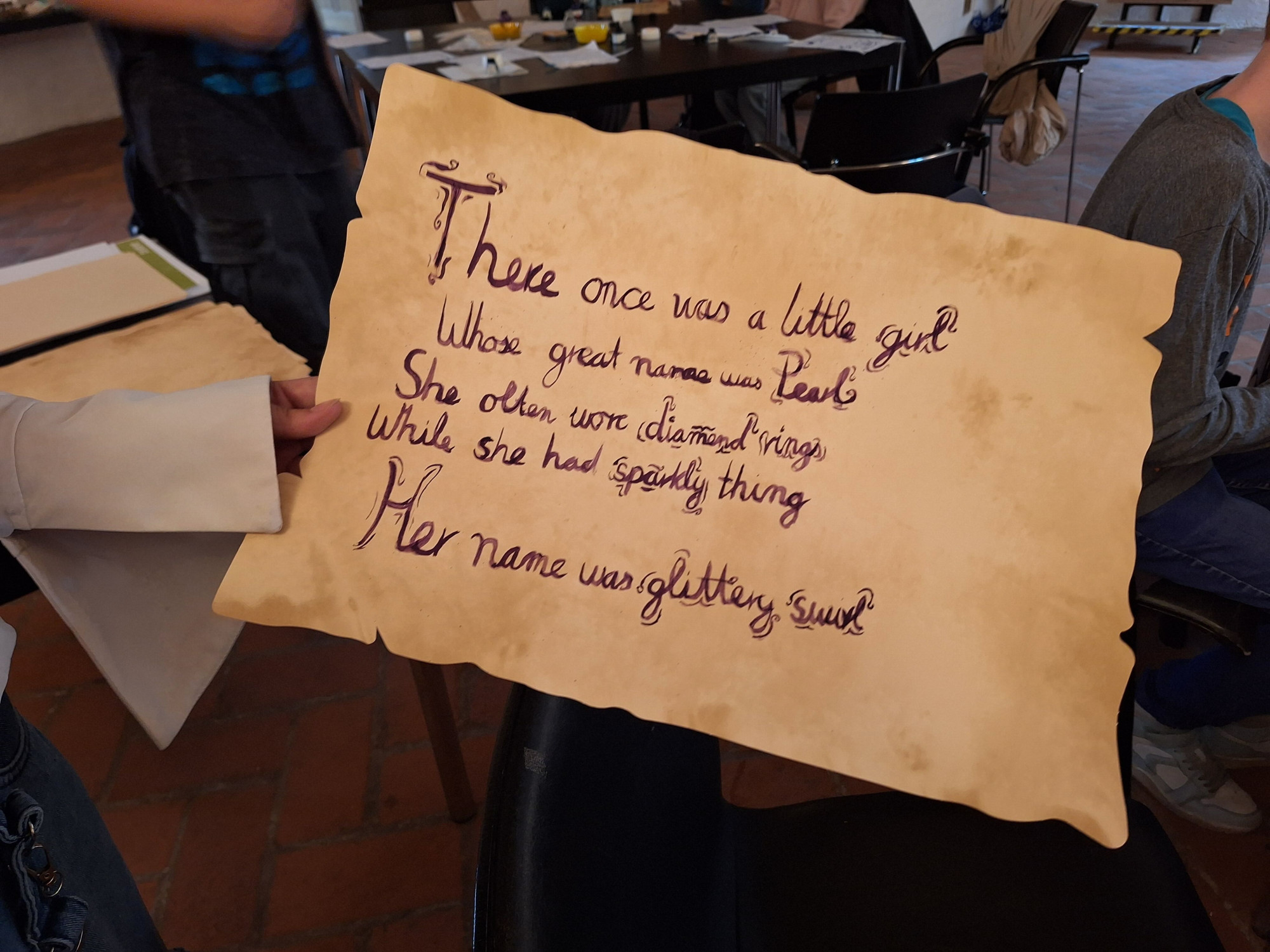 Den Abschluss bildete das Schreiben der Limericks auf Urkundenpapier. Als Vorbild galten die am Tag zuvor gesehenen kalligraphisch gestalteten Originaldokumente aus dem Stadtarchiv.”