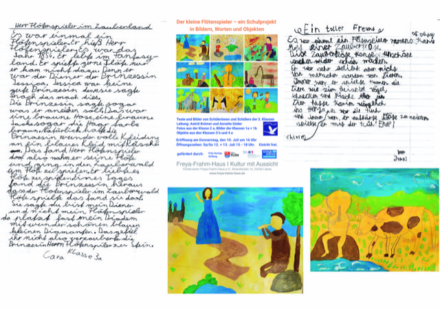 An weiteren drei Projekttagen werden die beiden beteiligten Klassen in zwei Gruppen aufgeteilt. Eine Gruppe zeichnet und gestaltet zuerst in zwei Doppelstunden mit der Kulturvermittlerin und Künstlerin Astrid Krömer den Kleinen Flötenspieler in eine Landschaft/ einen Raum zusammen mit eine weiteren Figur der Wahl. Die andere Gruppe erstellt in einem Schreibkurs mit der Autorin und Kulturvermittlerin Annette Göder jeweils eine Geschichte zum Kleinen Flötenspieler. Am nächsten Tag werden die Gruppen getauscht.