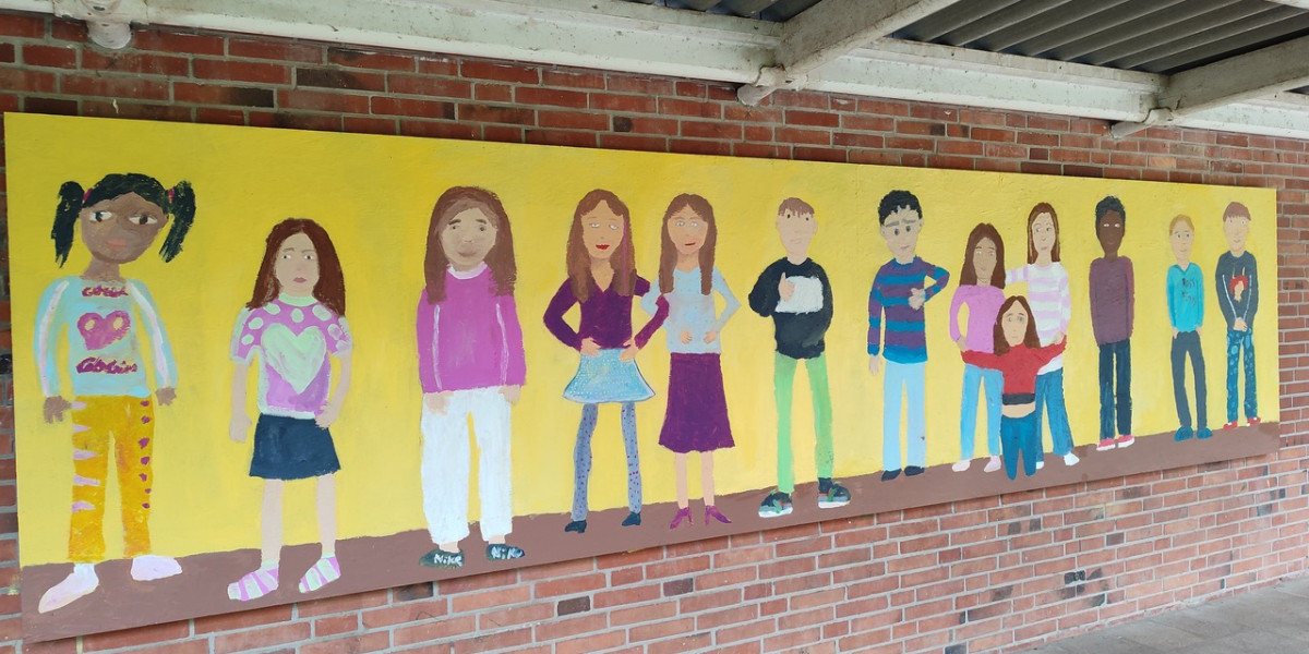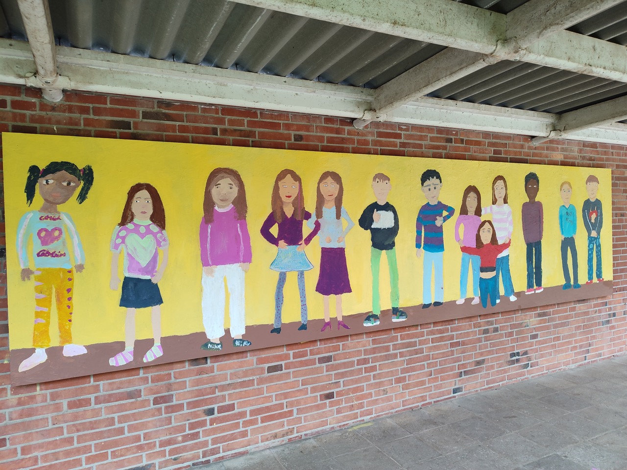 2. Phase (zweite fünf Monate): Arbeit mit Kindern der 3. Klassen. Hier lag der Schwerpunkt auf dem Erlernen und Darstellen der menschlichen Figur – Proportionen, Gesicht, Hände und Füße. Zunächst entstanden kleinere Zeichnungen und Malereien, anschließend konnten die Kinder ihre Figuren auch in Lebensgröße umsetzen. Etwa zwei Drittel der beiden 3. Klassen nahmen dieses Angebot wahr und verewigten sich mit großformatigen Figurenbildern auf einer rund 1 x 9 Meter großen Außenwand in der Nähe ihrer Klassenräume. Dieses Gemeinschaftswerk wurde zum sichtbaren Ausdruck der Kreativität und des Selbstbewusstseins der Kinder.